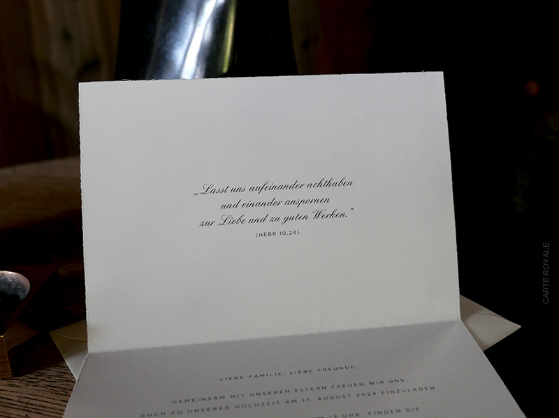 Auf dem Foto der Einladungskarte sehen Sie einen beispielhaften Text für Ihre Einladung, den Sie im nächsten Schritt individuell anpassen können. Nach Zahlungseingang erhalten Sie Ihren persönlichen Entwurf als PDF zur Freigabe. Korrekturstufen sind im Preis inbegriffen. Nach Ihrer verbindlichen Druckfreigabe senden wir Ihnen Ihre Hochzeitseinladungen sicher verpackt innerhalb von 5-7 Werktagen per Post zu.