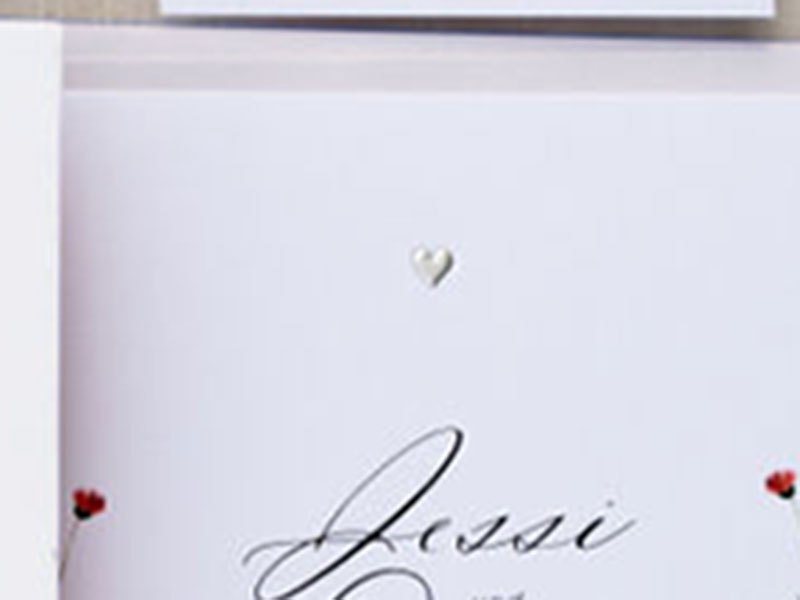 Minimalistische Einladungskarte mit floralen Muster und erhabenem Silberherz, geprägt auf Feinstpapier.