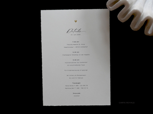 Vervollständigen Sie Ihre Einladung mit einer geschmackvollen Einlegekarte, die durch goldene Reliefprägung besticht und alle wichtigen Informationen zu Ihrer Hochzeit klar und übersichtlich darstellt.