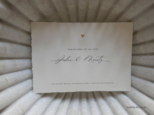 Die Ouvertüre: Die Floral Royale Save-the-Date KarteUnsere exklusive Save-the-Date Karte „Floral Royale“ wird auf edlem Büttenpapier gedruckt und in unserem Atelier mit einer antiken Presse von Hand veredelt. Ein matt-goldenes Herz wird als erhabene Reliefprägung, kaschiert mit Goldfolie, präzise eingeprägt und verleiht der Karte eine besonders erhabene Eleganz. Das Büttenpapier, ein hochwertiges Feinstpapier, besticht durch seine natürlichen Büttenränder an allen vier Seiten, eine halbmatt crème-weiße Oberfläche und eine weiche, luxuriöse Haptik.