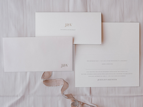 Diese Hochzeitspapeterie Hochzeitspapeterie aus cremefarbenem Papier mit goldgeprägten Initialen strahlt romantische Feierlichkeit aus und erinnert an den sanften Mondschein, während sie durch ihre schlichte Gestaltung besticht.