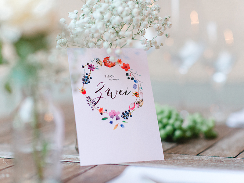 Hochwertige Tischnummern in kalligrafischer Schrift mit buntem Blumenkranz in Aquarellfarben. Ab 3 Tischkarten.