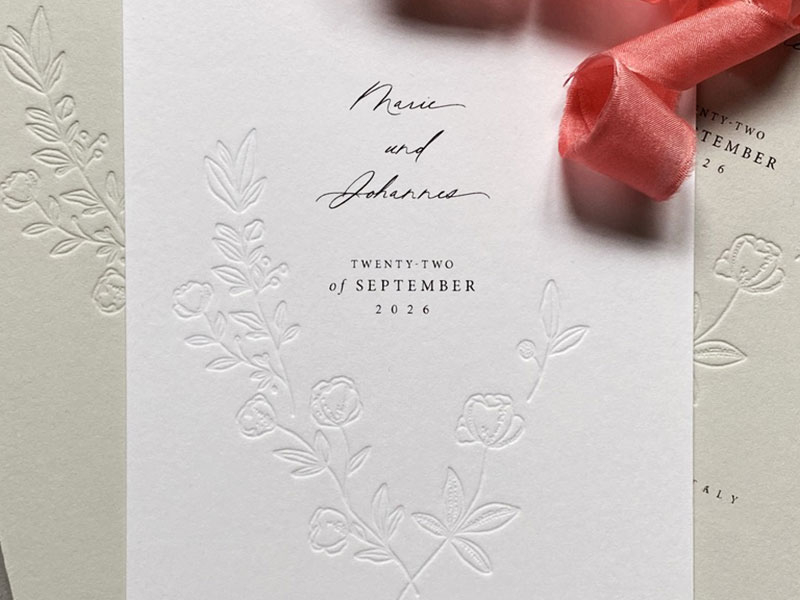 Letterpress Save-the-Date Karte mit Tiefprägung floraler Elemente und feiner Typografie – reduziert, elegant, zeitlos. Für alle, die Wert auf feine Details und Handwerkskunst legen. Format Din A6 inkl. edlem C6 Briefumschlag in grey light.