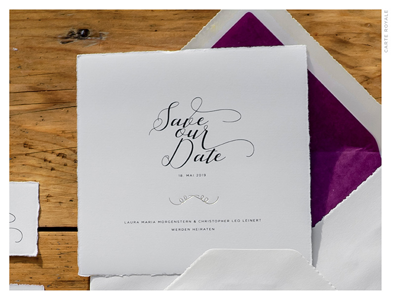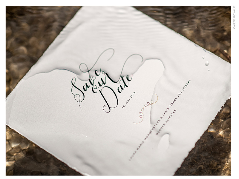 Der perfekte Aufmacher vor der Einladung - die kalligrfie Save-the-Date Karte mit gold geprägtem Ornament gedruckt auf Büttenpapier.