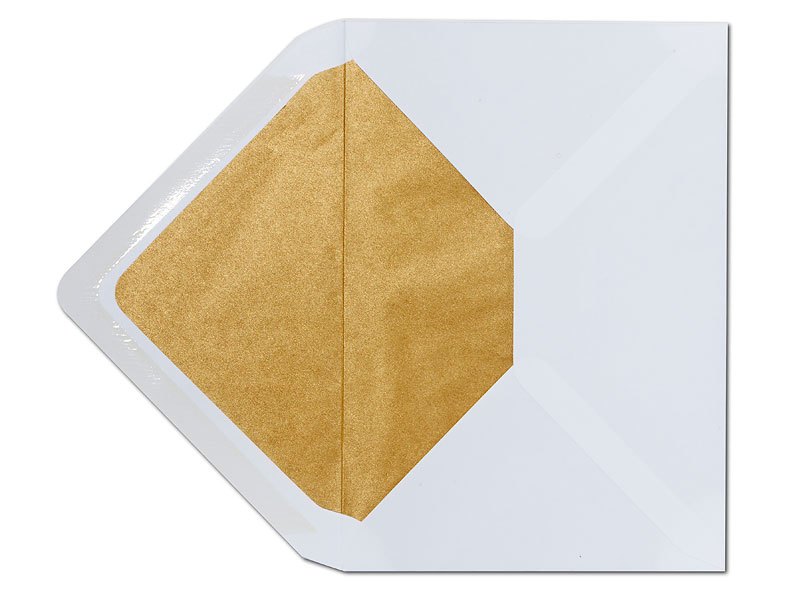 Hochwertige Kuverts für Einladungen, Geburtstags- & GlückwunschkartenDie schönsten Kuverts für Ihre exklusiven Einladungen, Geburtstagskarten oder Glückwunschkarten. Hochwertige weiße Briefhüllen mit goldenem Seidenpapier gefüttert, überraschen besonders auf den 2. Blick. Gefüttert mit edlem Seidenpapier in Gold lassen sie nur eins zu: Liebevolles Öffnen. Die Mindestbestellmenge liegt bei 25 Stück.